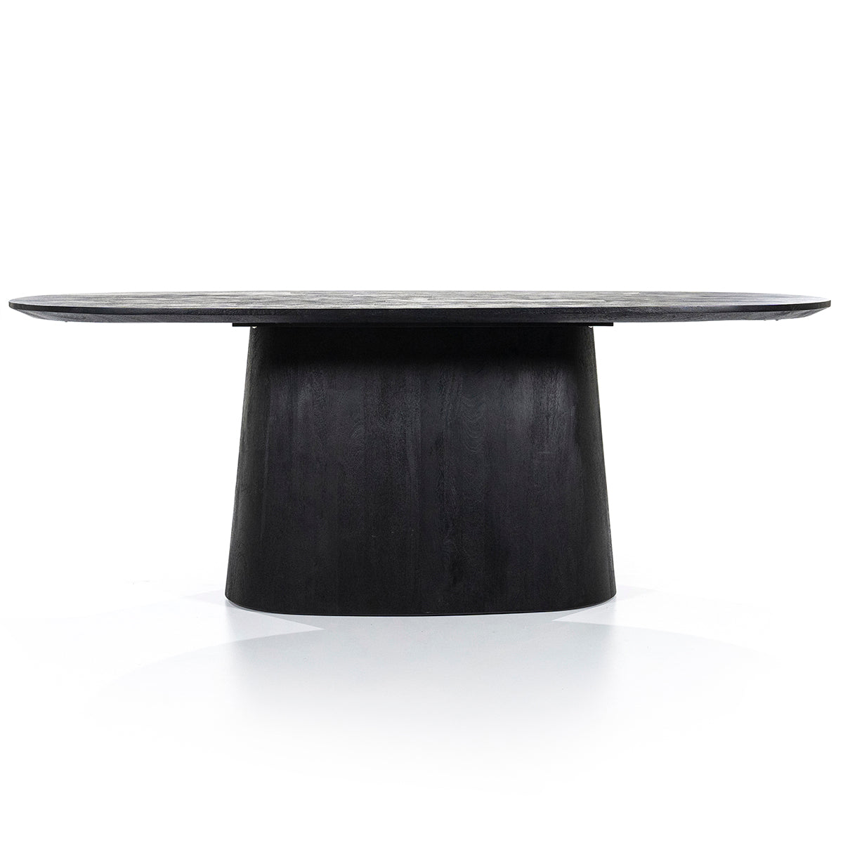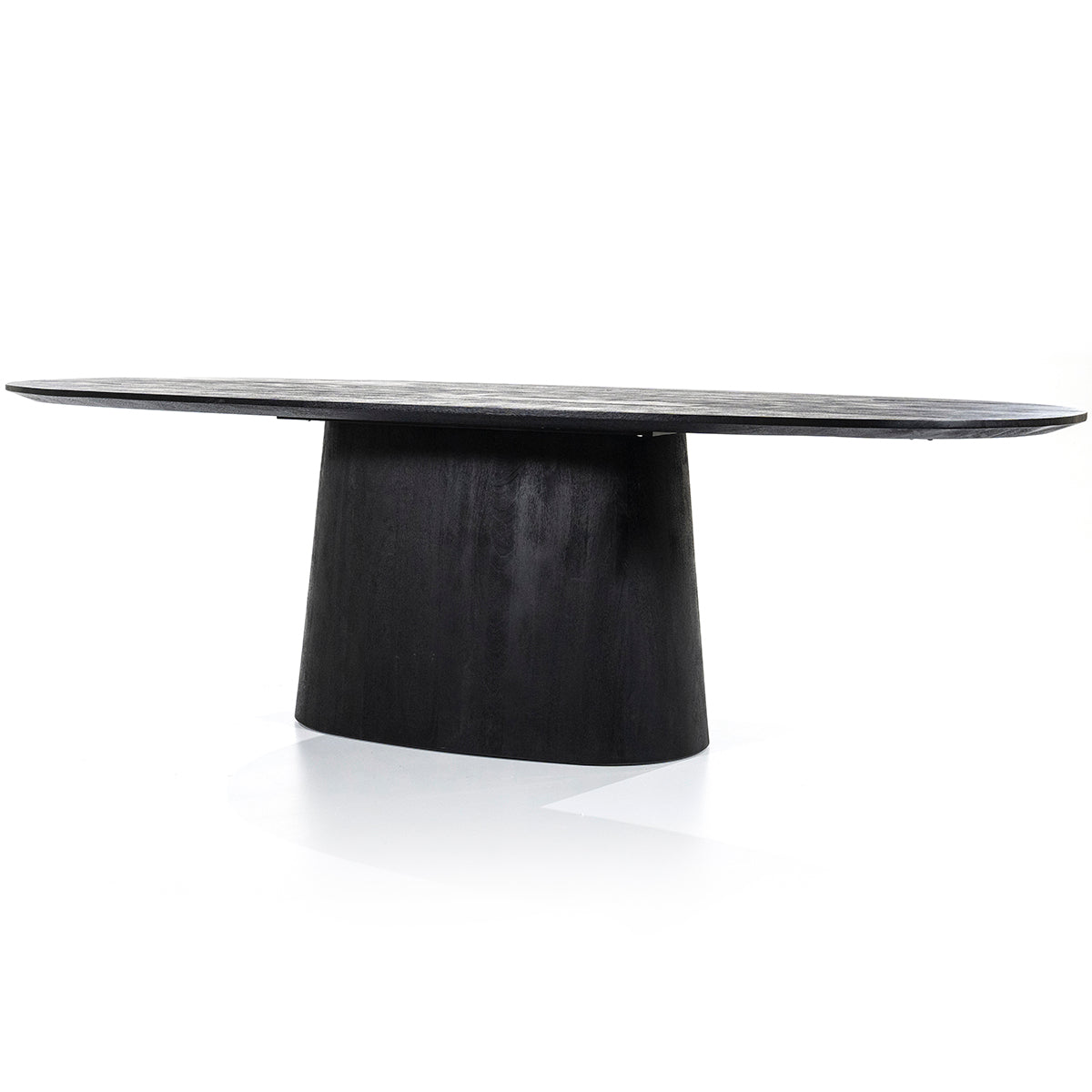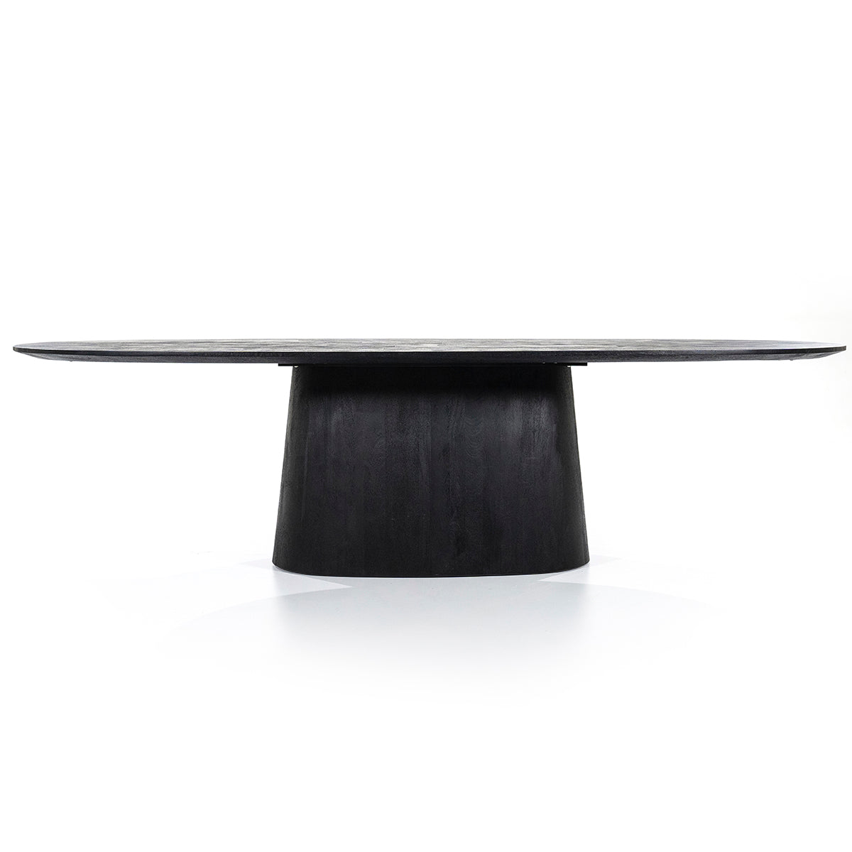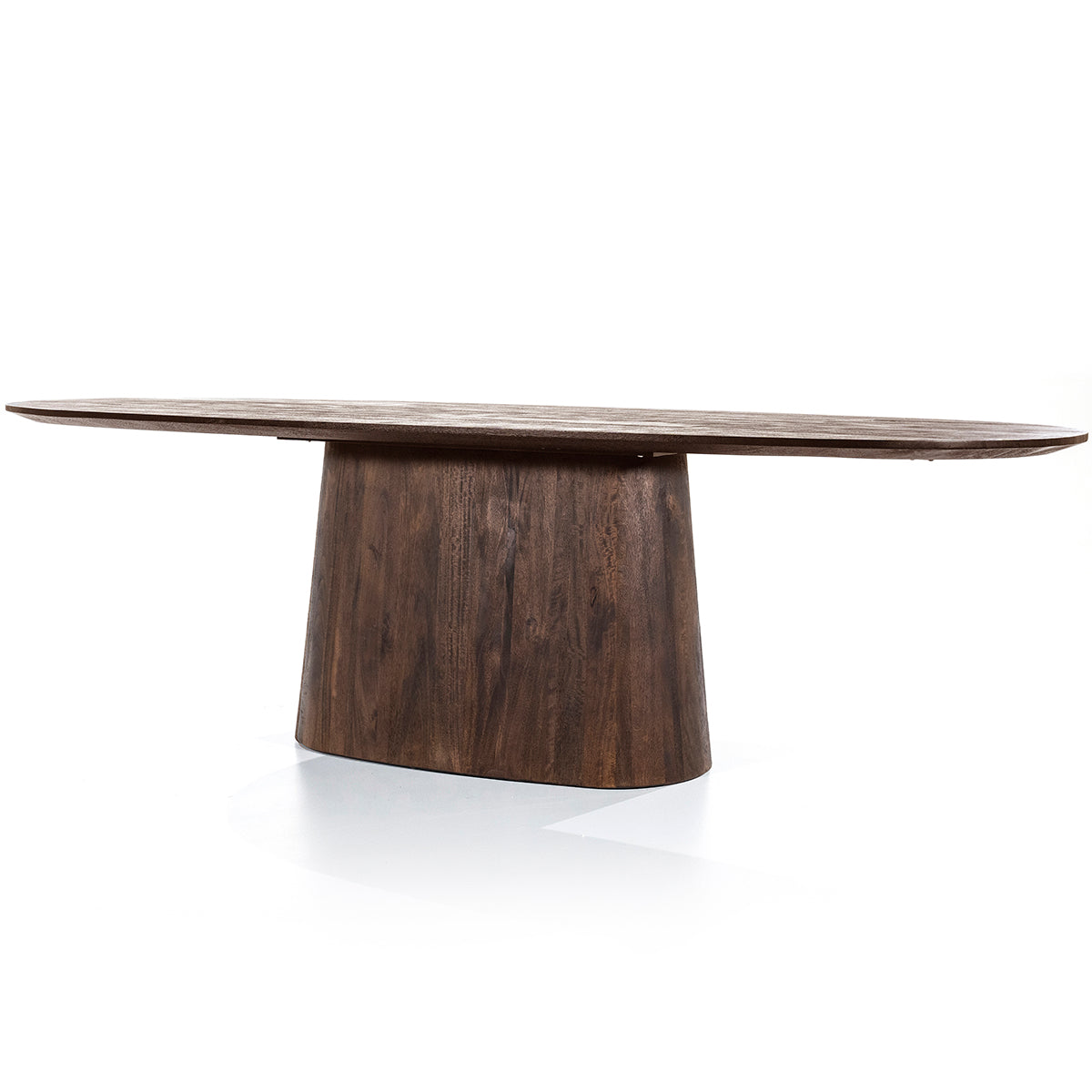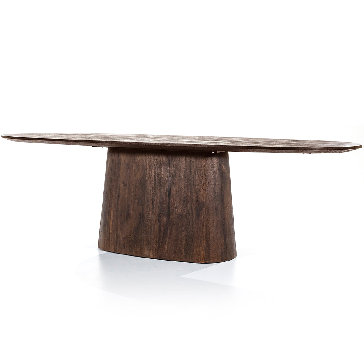 Aron Oval Dining Table comes from the collection of the brand Eleonora. The dining table is made entirely of mango wood in a warm colour. The top has an airy oval shape with a robust wooden leg. Thanks to the leg in the middle of the table, optimal use can be made of the space around the table.