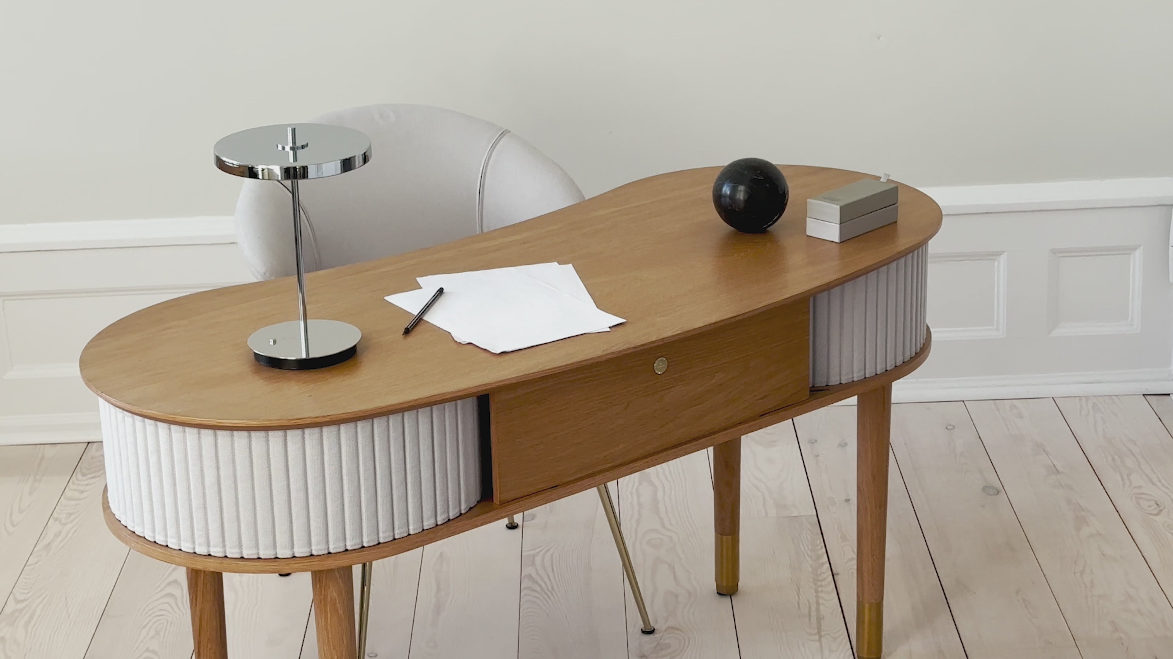 The Audacious desk is a timeless desk with details that enhance productivity and declutter the workspace. The curved, organic silhouette of the desk evokes a sense of Nordic grace, while the sliding fabric tambour doors add a touch of modern nostalgia, creating a seamless transition between past and present.