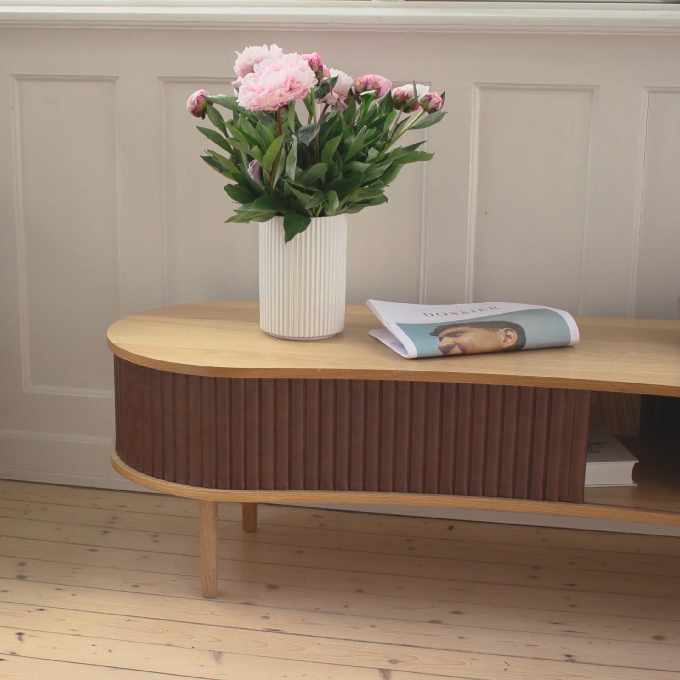 The Audacious side table is available in oak, dark oak and black oak with tambour doors in fabrics and faux leather of different carefully selected colours.
