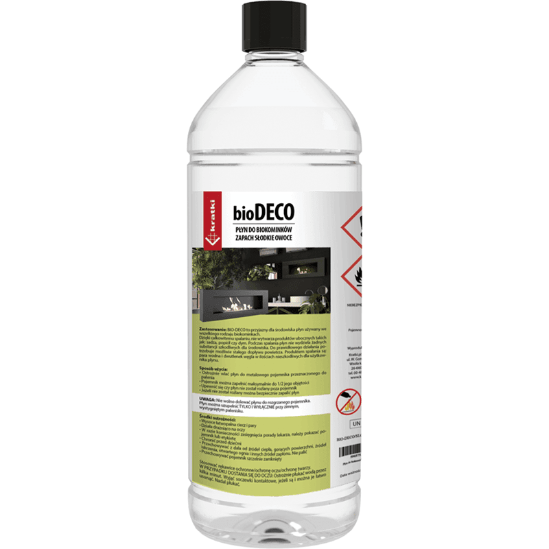 A special liquid for use in fireplaces as an ecological source of energy. Obtained from biological alcohol, it is fully combusted without emitting odour or smoke. The products of combustion are water vapour and carbon dioxide in amounts similar to air exhaled by man. It is therefore completely safe for health. The fuel has been tested and approved for use by the National Institute of Public Health.