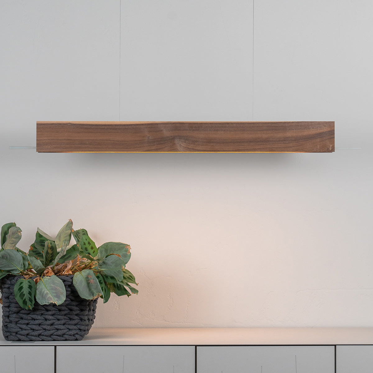 The Blaze Pendant is a hanging version of the wall lamp, featuring a rectangular form and a unique combination of raw solid American walnut wood and frosted OptiWhite glass.