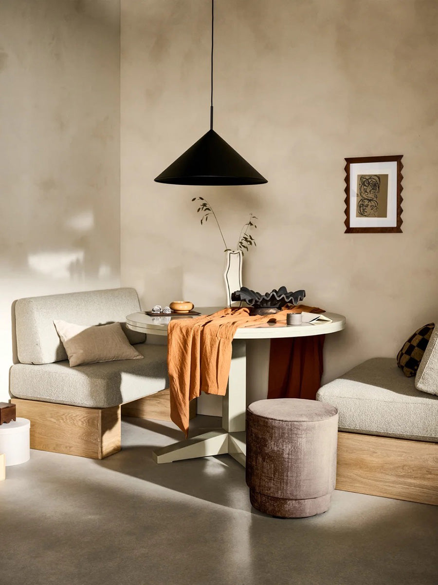 Robust, sturdy and generous. This coarse dining table from the collection of the Dutch brand Vtwonen is a real mood enhancer in the dining area. The Deck Round dining table looks solid and the light grey clay shade immediately creates a timeless look. This subtle colour matches well with various fabrics and colours, so plenty of combination possibilities with dining chairs! Space for 4-5 people.