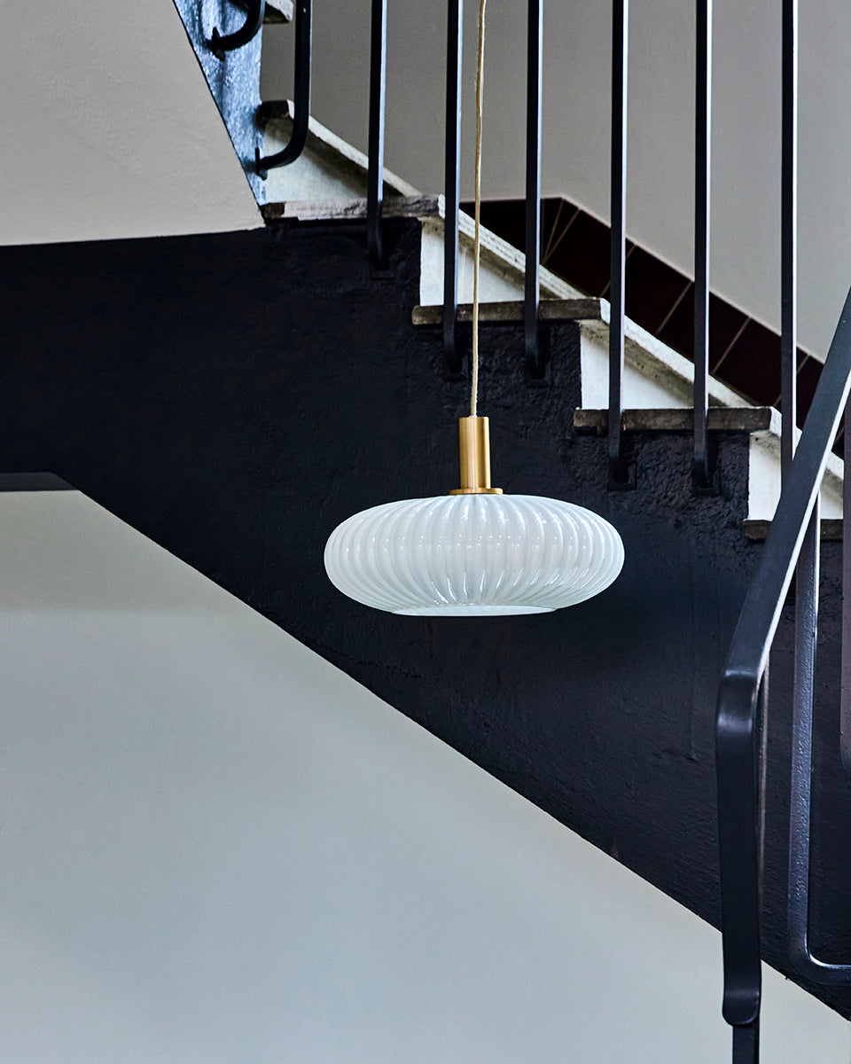 This pendant lamp brings elegance and warmth wherever you hang it. Off-white ribbed glass creates a refined look, while the antique brass finish brings timeless character. Handmade craftsmanship makes each piece unique. Let it light up your dining table, create a soft glow in the hallway, or become the focal point above your living room seating. This pendant combines striking style with inviting, functional lighting.