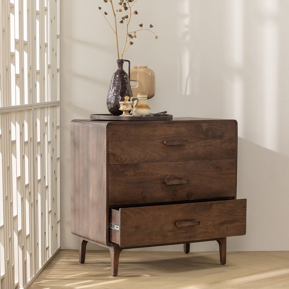 Liya is an elegant chest of drawers from the collection of the Dutch brand WOOOD. The chest has three spacious drawers, each with a playful yet refined handle. Thanks to the generous storage space, you can easily keep your belongings out of sight and create a sense of calm in your interior. The chest of drawers is made from high-quality mango wood and finished in a deep, dark brown colour. The natural wood pattern gives Liya a warm, luxurious look, making this piece of furniture a real eye-catcher in any living space.