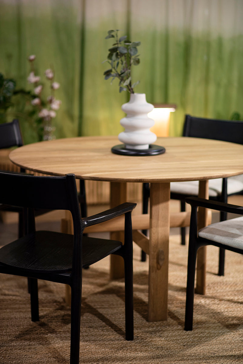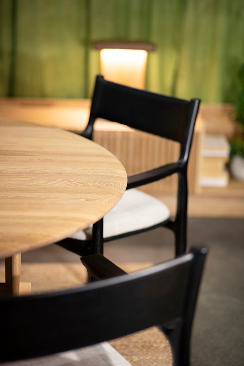 The OLIO table is the essence of natural beauty and exceptional harmony, encapsulated in a perfectly balanced form. Made from solid oak wood, it captivates with its subtle grain patterns and the warm tone of the natural material. Its round tabletop, with gently rounded edges, creates a welcoming atmosphere, making shared moments around the table even more enjoyable.