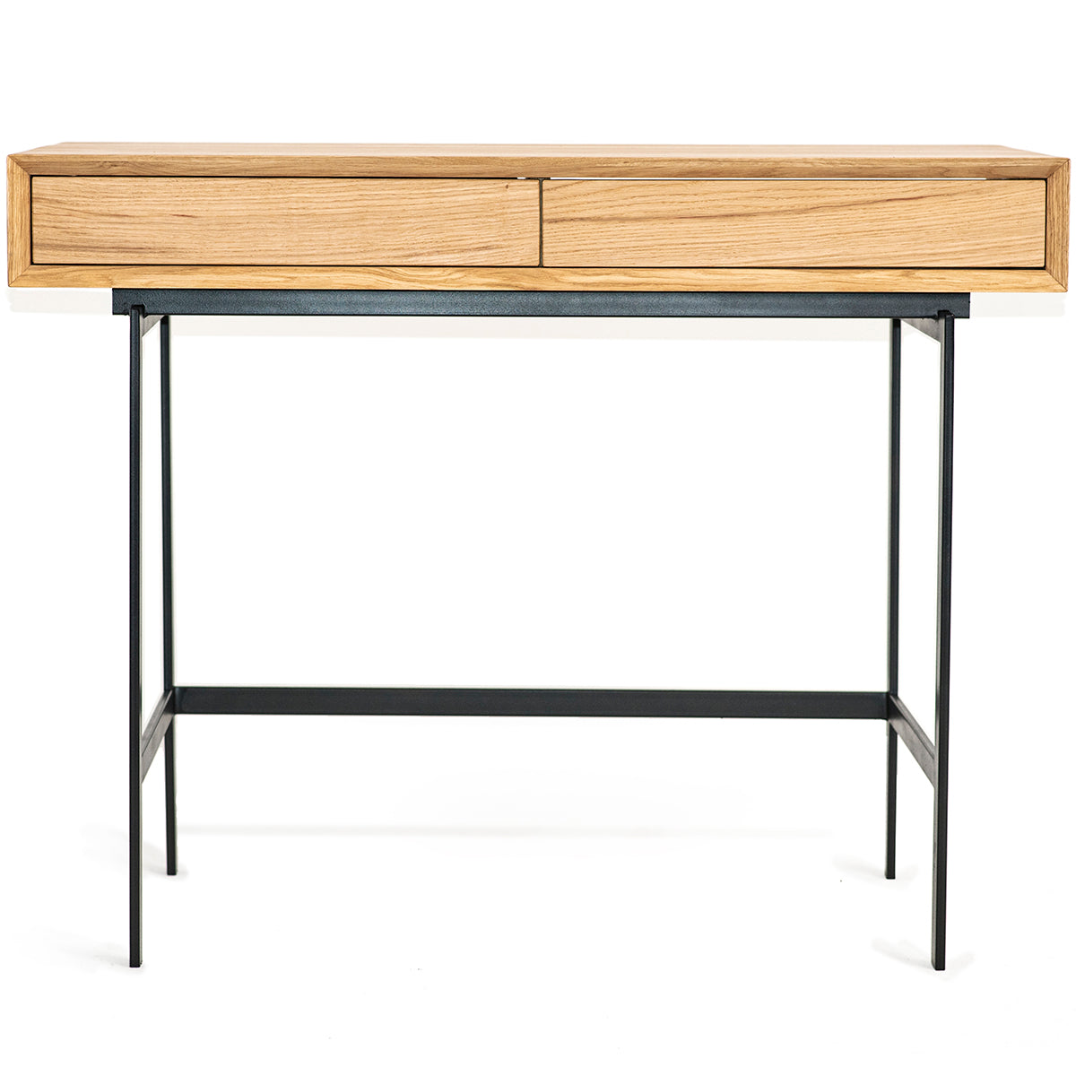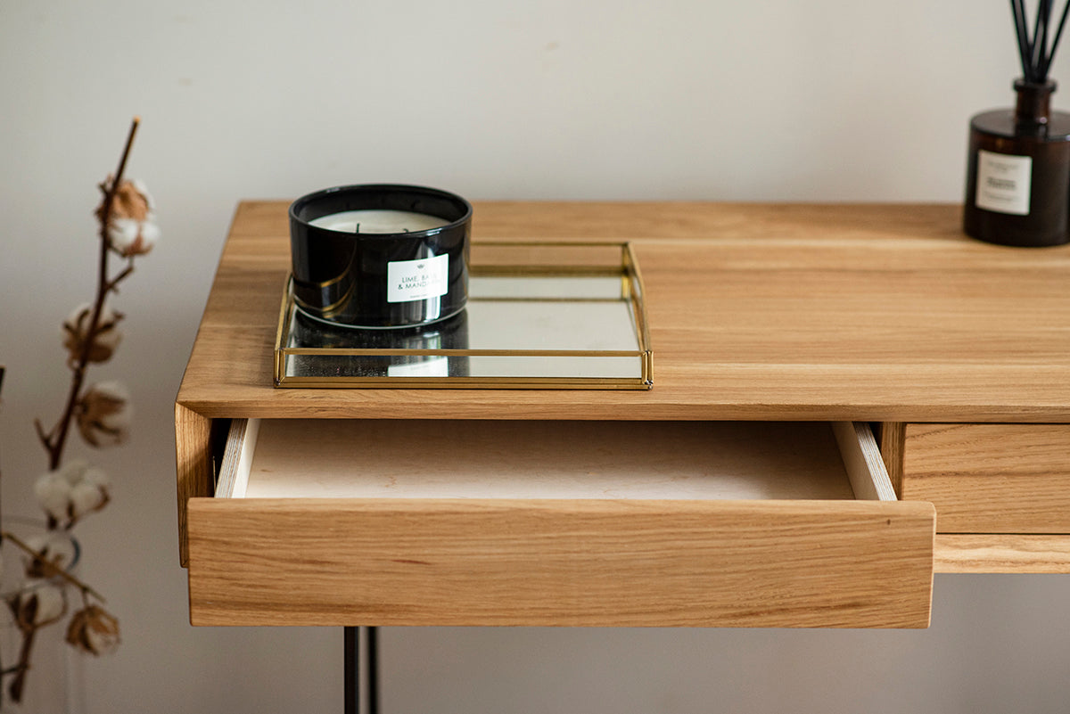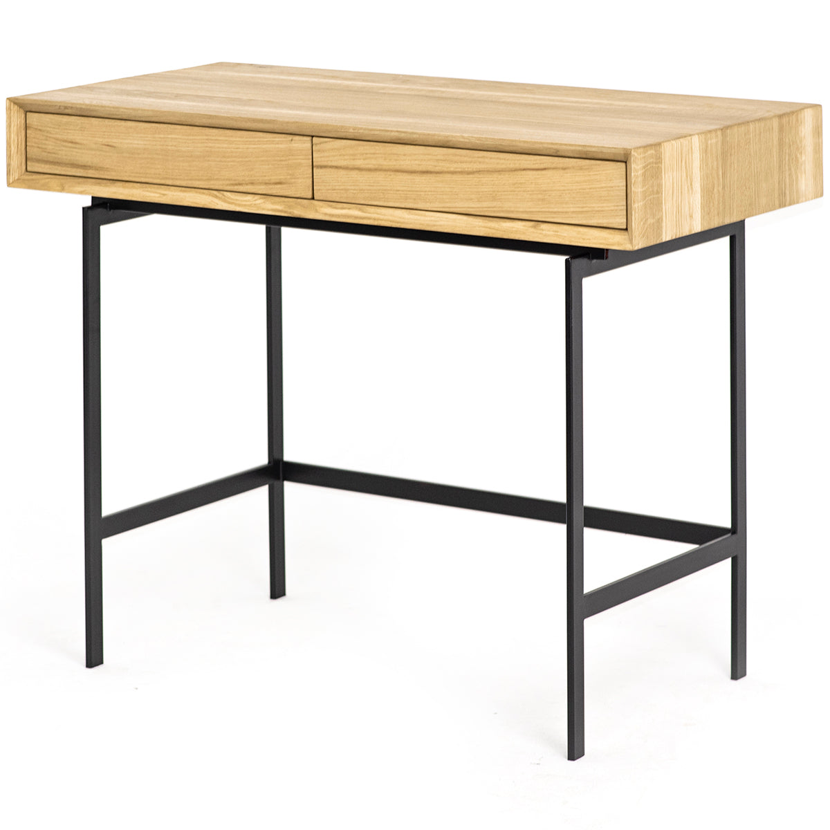 The minimalist Rosto desk with a steel base is an excellent choice for a home office. The oak Rosto desk is equipped with two drawers on Blum tip-on slides, which will accommodate office accessories. It will blend equally well with modern and Scandinavian interiors as well as with boho style. The desk is made of solid oak wood, and the base is made of black lacquered steel.