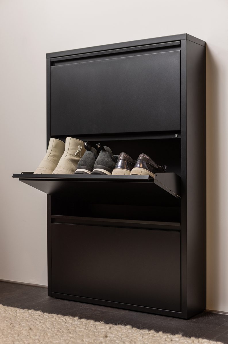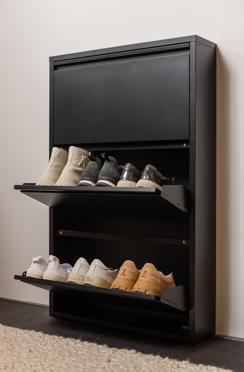 This sleek shoe cabinet comes from the collection of Dutch interior design brand WOOOD and looks inconspicuous with its handle-free design. The Sabine shoe cabinet has a three practical storage compartments, room enough for your trainer collection.