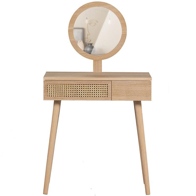 The Soof table is multifunctional for its practical simplicity. The table from the collection of Dutch interior design brand WOOOD features a practical mirror in a stylish, minimalist circle. The smooth-finished pine wood in the light colour gives a Scandinavian feel and the two drawers offer practical storage space for small trinkets.